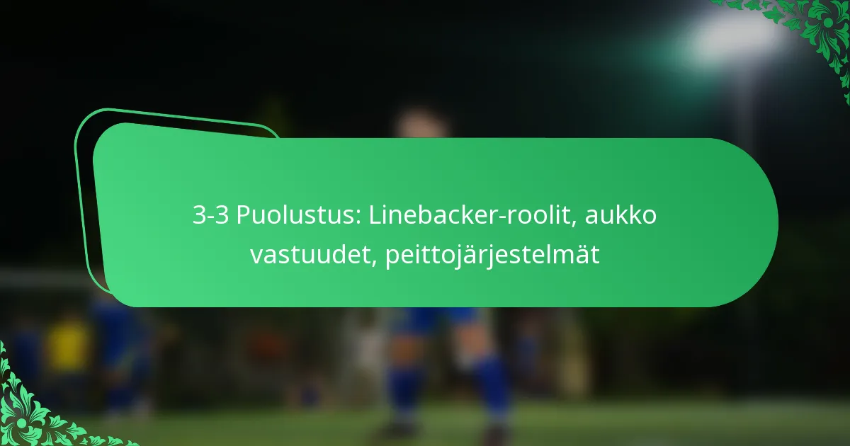 3-3-puolustus on jalkapallomuoto, joka hyödyntää kolmea puolustavaa linjamiehen ja kolmea linebackeria, suunniteltu tarjoamaan joustavuutta sekä juoksua että heittoa vastaan. Tämä järjestelmä korostaa aukkojen hallintaa ja monipuolisia peittovaihtoehtoja, mikä tekee siitä tehokkaan erilaisille hyökkäysstrategioille.