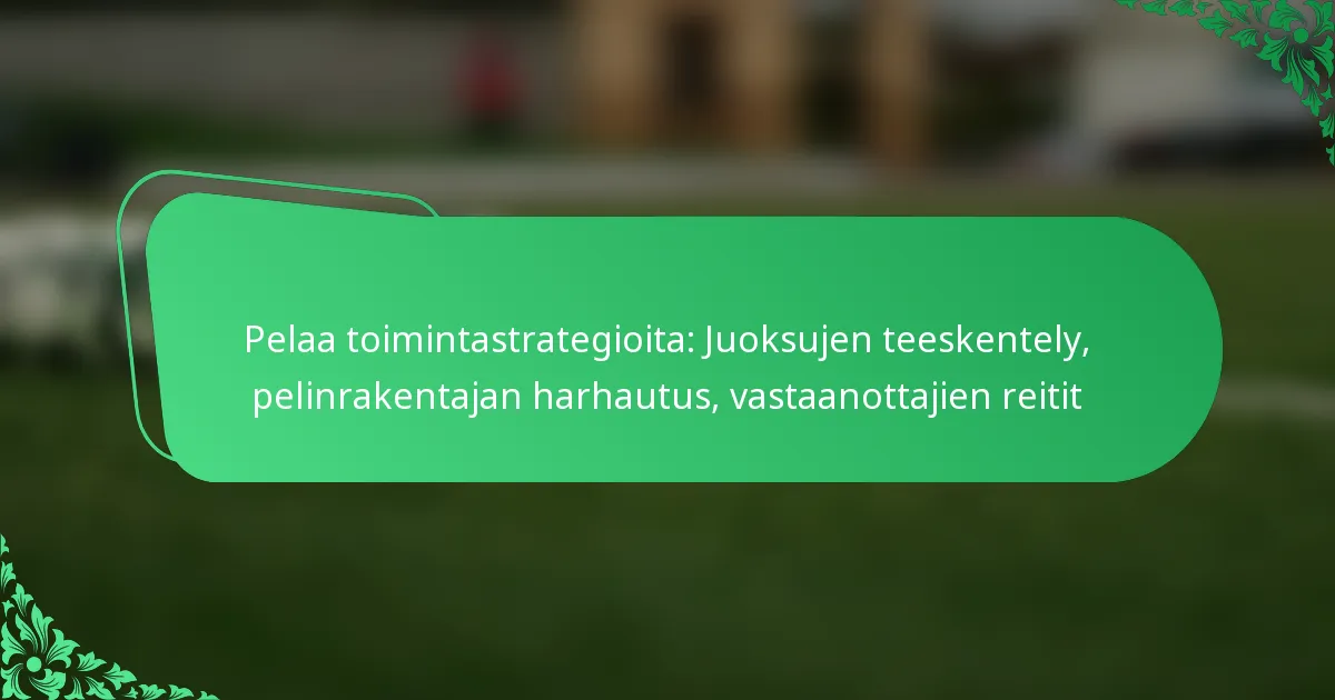 Pelitoimintastrategiat jalkapallossa hyödyntävät petoksen taidetta teeskentelemällä juoksuja, jotta puolustus johdetaan harhaan, avaten näin mahdollisuuksia syöttöpeleille. Toteuttamalla uskottavan käsivarren valehtelemisen, pelinrakentajat voivat houkutella puolustajia pois tarkoitetuilta kohteiltaan, jolloin vastaanottajat voivat hyödyntää syntynyttä tilaa hyvin ajoitetuilla reiteillä. Tämä taktinen lähestymistapa ei ainoastaan paranna hyökkäyksen tehokkuutta, vaan se myös perustuu tarkkaan toteutukseen ja ajoitukseen vaikutuksen maksimoimiseksi.